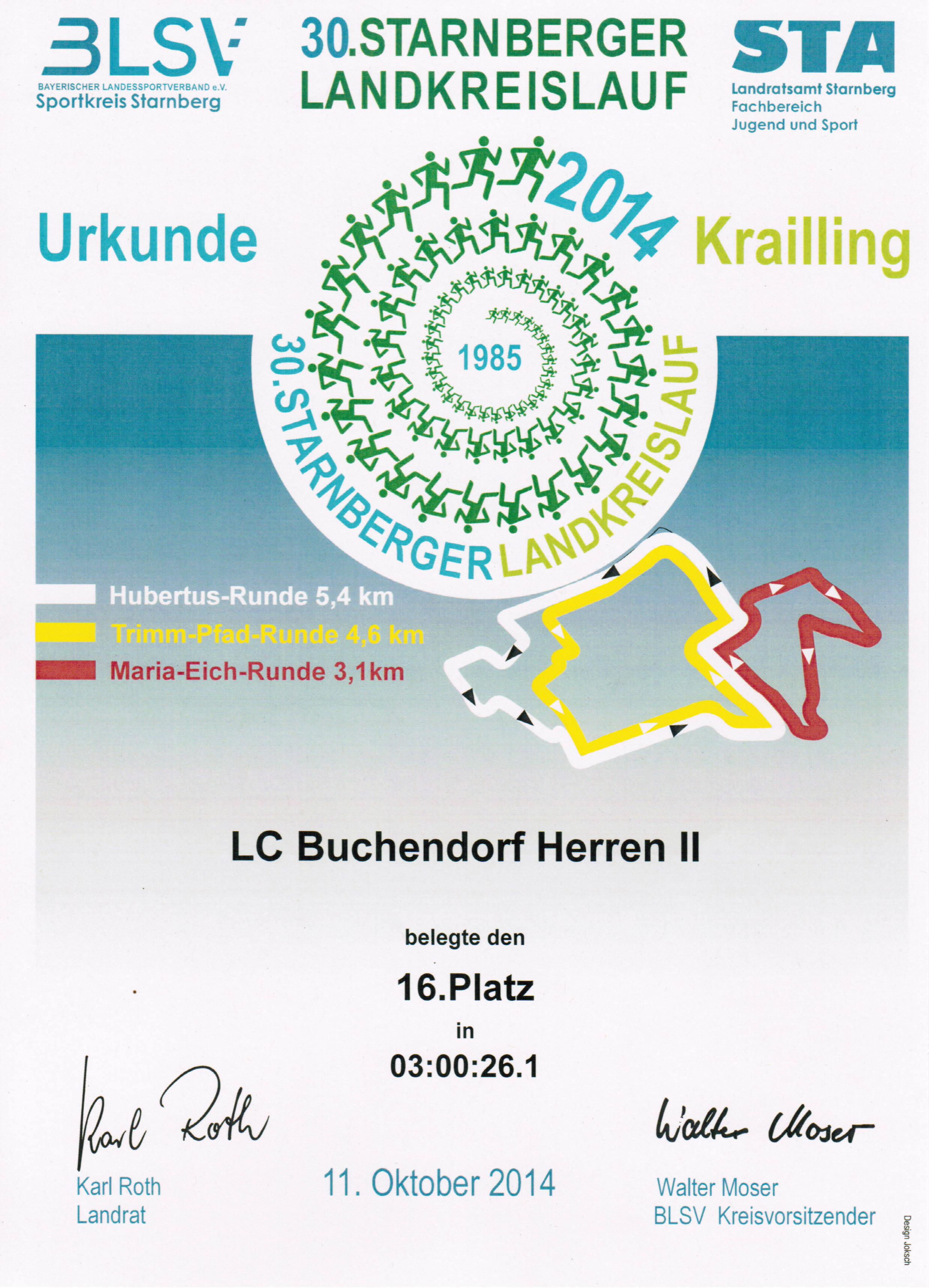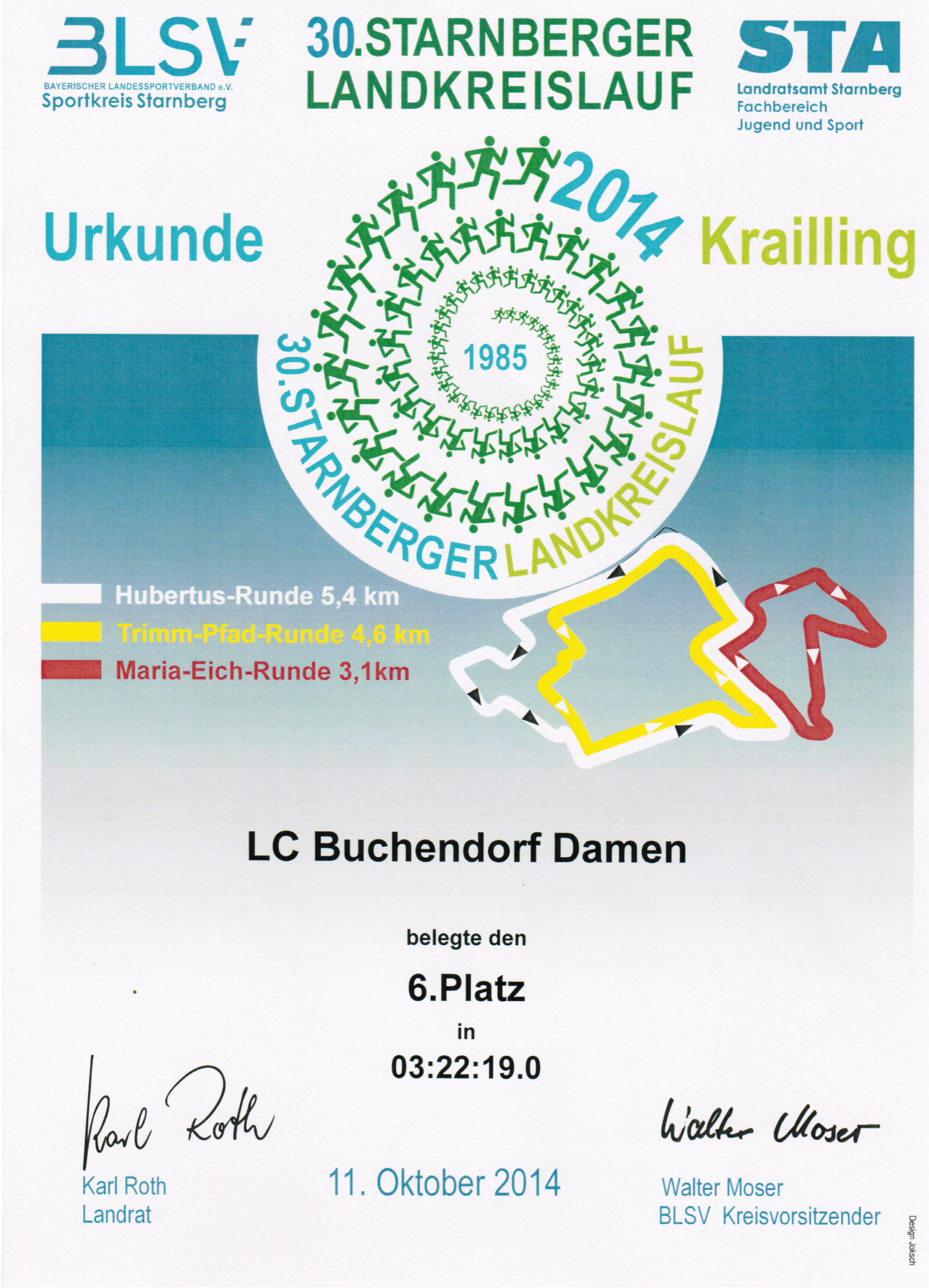 Am 11. Oktober 2014 fand der Landkreislauf als Staffel über insgesamt 42,4 km in Krailling statt. Die Temperatur war für Mitte Oktober ungewöhnlich warm und nicht einmal der Frühnebel war zu sehen. Es kamen 169 Mannschaften mit je 10 Teilnehmern ins Ziel. Wir waren diesmal – wie im letzten Jahr – wieder mit 4 Mannschaften dabei:
